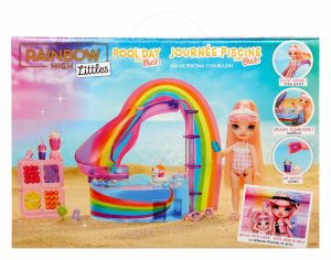 Obsah balenia: Exkluzívna Malá sestrička v outfite Bazén s dúhovou šmykľavkou obsahuje smoothie stánok s mixérom, ovocie, tégliky a množstvo doplnkov pre deň strávený pri bazéne.