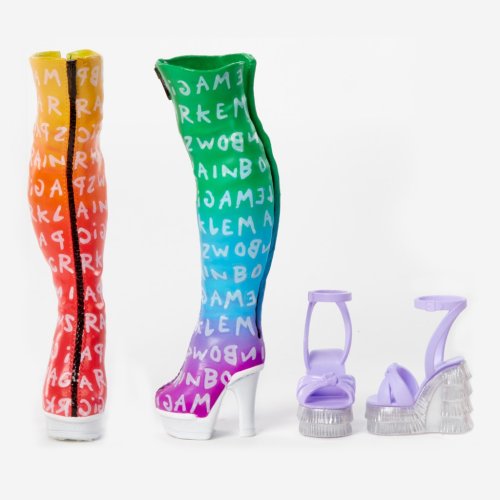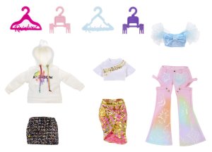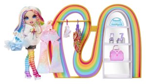 Obsah balenia: • 1 bábika • Šatník s dúhovou stenou • 6 módnych kúskov • 2 páry topánok • 2 kabelky • 1 hrebeň • Šatníkový stojan so 4 ramienkami • 4 poschodové regály na topánky