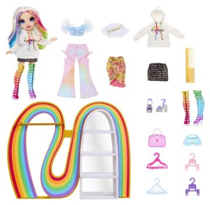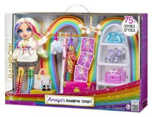 Zapoj svoju fantáziu s novým Amayiným Dúhovým Šatníkom. Tento herný set obsahuje Fashion bábiku s dúhovými vlasmi a topánkami. V balení nájdeš štýlové oblečenie na ramienku, kabelky a topánky, s ktorými vytvoríš viac ako 75 lookov. Vyber ten najlepší outfit pre svoju bábiku!