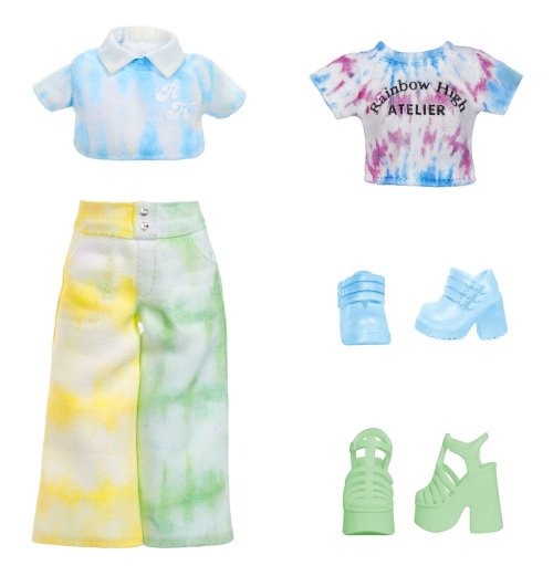 Urobte si svoju vlastnú Rainbow High bábiku! V balení nájdeš bábiku s bielymi vlasmi oblečenú od hlavy po päty do bielej farby a 6 zmývateľných dúhových práškov (červený, oranžový, žltý, zelený, modrý a fialový), gumičky na batikovanie a aplikačnú hubku. Existuje nekonečne mnoho spôsobov, ako vyfarbiť oblečenie bábiky alebo jej vlasy. Po dokončení môžeš bábiku opláchnuť a vyfarbiť ju úplne inak. Prášok nasypeš do vody. Do farebnej vody môžeš namočiť vlasy a oblečenie, alebo hubku, ktorou budeš vytvárať vzory. Pomocou gumičiek zviaž oblečenie a vytváraj rôzne batikovaný outfit.