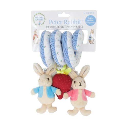 Zabavte deti s touto krásnou hračkou - špirálou. Je plyšová, sú na nej zavesení králiky Peter a Flopsy. Špirála tiež hrká, takže stimuluje zmysly detí.