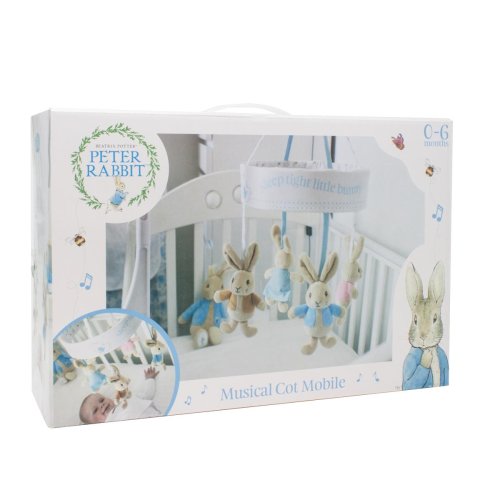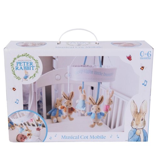 Nádherný hudobný kolotoč nad postieľku, ktorý prehráva melódiu „Sleep tight little bunny“. Obsahuje štyri postavičky z pôvodných príbehov Beatrix Potterovej. Zajačik Peter, zajačik Flopsy, zajačik Benjamin a zajačik Cotton Tail. Držiak kolotoča je súčasťou balenia. Hlavné vlastnosti: hudba začne hrať iba po natiahnutí motorku ideálny darček k narodeniu alebo krstinám