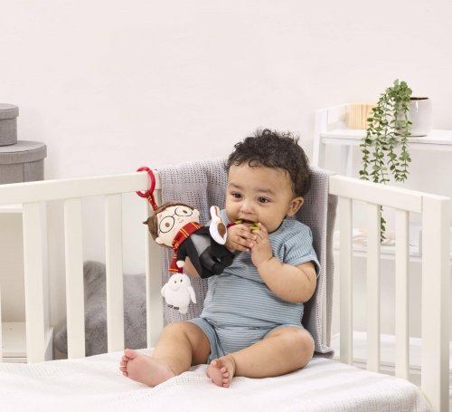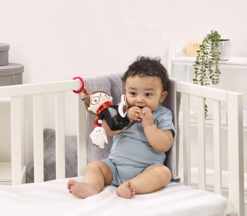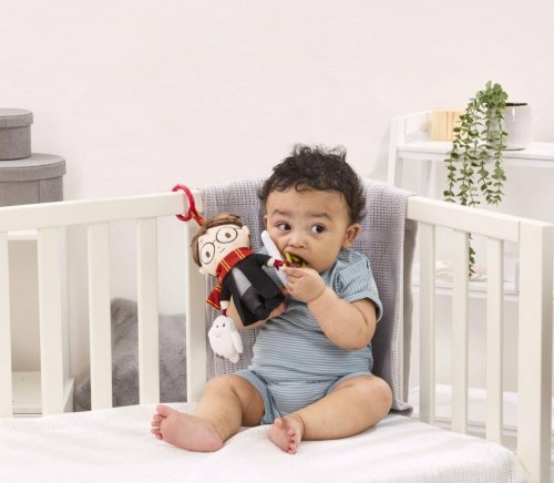 Plyšový kamarát s hryzátkom a hrkálkou a pískajúcou sovou! Je čas na kúzelné dobrodružstvá s Harrym Potterom! Táto zábavná závesná hračka bola navrhnutá tak, aby stimulovala zmysly dieťaťa a podporovala hru v ranom vývoji. Plyšový Harry Potter s hryzátkom v tvare hviezdy má svoje typické okrúhle okuliare a jazvu po blesku, je oblečený do bradavickej róby a na krku má farebnú Chrabromilskú šatku. Harryho sprevádza aj jeho verná metla Guľový blesk, ktoré vydáva jemný hrkavý zvuk, a jeho verná spoločníčka sova Hedviga, ktorá pri stlačení píska. Hračku je ľahké pripevniť na kočík, postieľku alebo autosedačku. Je preto ideálna nielen na doma, ale aj pre kúzelné chvíle na cestách. Je skvelým darčekom pre najmladšie čarodejnice a čarodejníka. Hlavné vlastnosti: • hviezdne hryzátko, hrkajúca metla Guľový blesk, pískajúca sova Hedviga, plyšový Harry Potter v dokonalom dizajne • vhodné od narodenia • skvelý darček pre malých fanúšikov čarovného sveta Harryho Pottera • napomáha k rozvíjaniu zmyslov • mäkký plyš • mäkký plyš • na kočík, postieľku alebo autosedačku