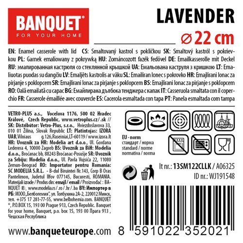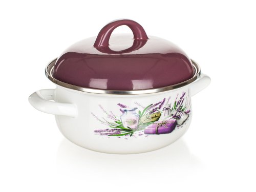 Smaltovaný kastról LAVENDER. Vysoká pokrievka vo fialovej farbe, kastról s bielou glazúrou a dekorom na vonkajšej strane. Kastról je možné používať na všetky typy varných dosiek.