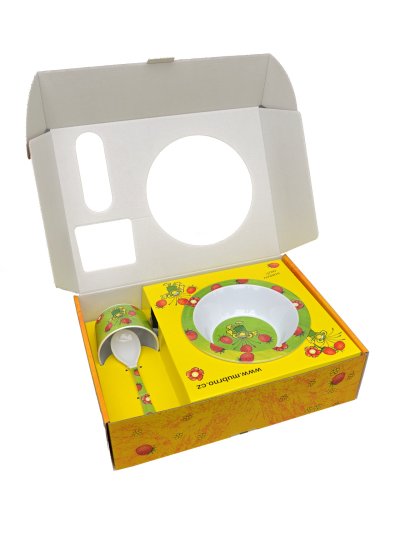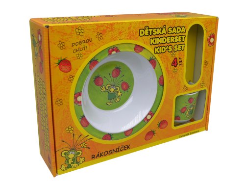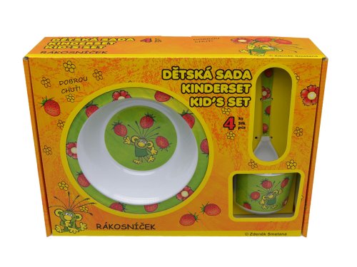 4-dielna darčeková sada detského riadu. Sada obsahuje tanierik pr.21cm , misku pr.16cm , hrnček s jedným uchom v.6,5cm a lyžičku d.14cm . Materiál 100% melamín bez ftalátov. Možno umývať v umývačke. Tlač v medzivrstve. Odporúčaný vek: od 6 mesiacov