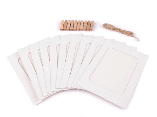 Sadu papierových rámčekov s drevenými štipcami a jutovou šnúrkou využijete na vystavenie fotografií, pohľadníc a malých obrázkov. Vyniknú v každom interiéri, okamihy na fotografiách tak budete mať neustále na očiach. Súprava č.1, 3 a 4 je určená na veľkosť obrázkov 11 x 15 cm. Sada č.2 je určená na veľkosť obrázkov 9,5 x 13 cm.
