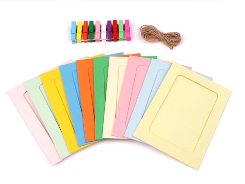 Sadu papierových rámčekov s drevenými štipcami a jutovou šnúrkou využijete na vystavenie fotografií, pohľadníc a malých obrázkov. Vyniknú v každom interiéri, okamihy na fotografiách tak budete mať neustále na očiach. Súprava č.1, 3 a 4 je určená na veľkosť obrázkov 11 x 15 cm. Sada č.2 je určená na veľkosť obrázkov 9,5 x 13 cm.