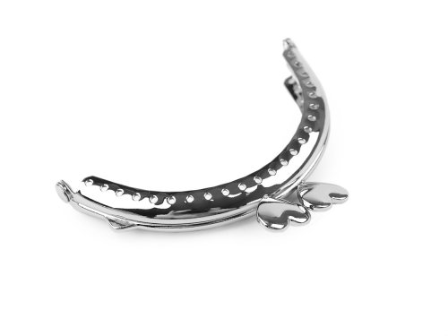Kovový rámček je vhodný na výrobu malej peňaženky. Vďaka zatváraniu sa srdiečkami pôsobia romanticky. Rámček je určený na našitie, kedy sa látka dovnútra vloží a ručne prešije cez dierky, ktorých rozpätie je 5 mm. Dierky sú len na vonkajšej strane rámčeka, ktorá je dlhšia ako vnútorná, teda je našívanie jednoduchšie. Vnútorné rozmery rázvoru sú 7,3 x 7,5 cm. Vonkajšie rozmery rázvoru sú 8,5 x 8,7 cm. Výška zatvoreného rámčeka je 4,5 cm (vrátane zapínania 5,8 cm).