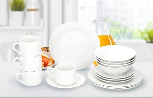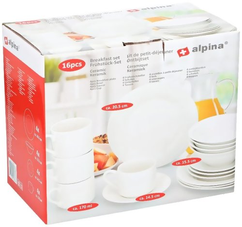 Táto 16dielna sada sa skladá zo 4 šálok (170 ml), 4 tanierikov (14,5 cm), 4 raňajkových tanierov (20,5 cm) a 4 misiek (15,5 cm). Sada je vyrobená z vysoko kvalitnej keramiky a je ideálna na každodenné použitie. túto sadu môžete jednoducho vložiť do umývačky riadu a je možné ju vložiť aj do mikrovlnnej rúry. Ideálne aj ako darček.
