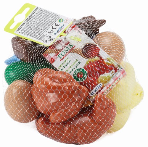 Makety rôznych potravín, v sieťke. S touto sadou máte všetky ingrediencie pre perfektné raňajky. Obsahuje balenie vajíčok a 2 vajcia, kura, párok, mrkva, uhorku, croisant, paradajkovú omáčku a polevy. Ideálne aj ako vybavenie obchodu alebo ako doplnok do detskej kuchynky. Rozmery produktu (DxŠxV): 19 x 19 x 13 cm.
