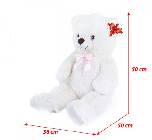 Plyšový medveď nesmie chýbať v žiadnej detskej izbičke! Medveď vo veľkosti 78 cm je vyrobený z kvalitnej hebučkej plyšu, má krémovo bielu farbu a krk mu zdobí ružová saténová mašľa. Tento plyšový kúsok je ideálnym darčekom pre malých aj veľkých! Súčasťou je papierová visačka v tvare srdiečka, na ktorú môžete napísať venovanie. Hlavné vlastnosti: visačka pre venovanie ručné spracovanie vysoko kvalitný plyš