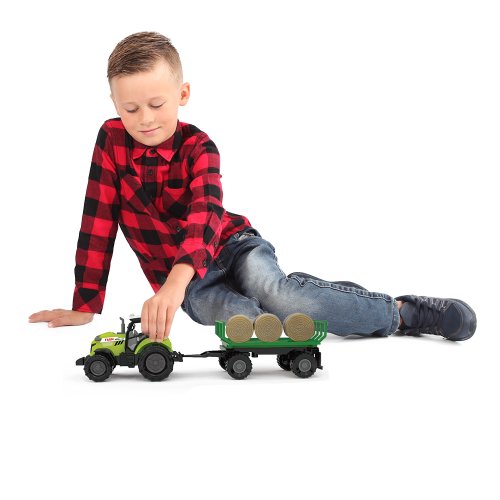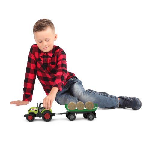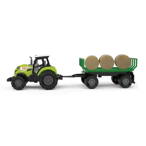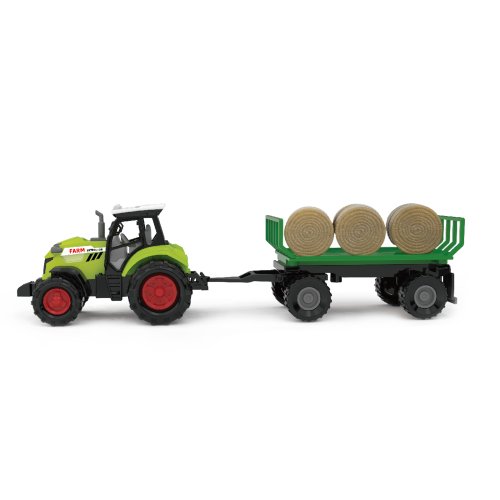 Moderný plastový farmársky traktor s vlečkou a balíkmi slamy, hračka z kolekcie Moja malá farma. Vlečka sa dá jednoducho odpojiť a balíky zložiť. Traktor jazdí na voľný chod a jeho dĺžka je 10 cm. Príves je v dĺžke 12 cm, celková dĺžka vrátane prívesu je 25 cm. Stlačením tlačidla na traktore vydáva reálne zvuky spolu so svetelným efektom. Traktor vyžaduje 3 ks batérií typu AG13/LR44, ktoré sú súčasťou balenia.