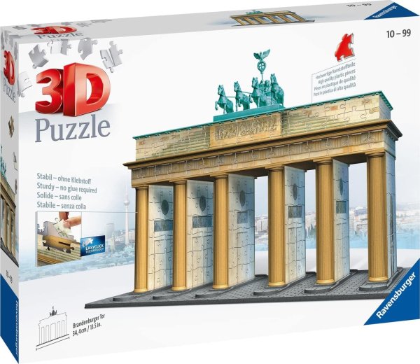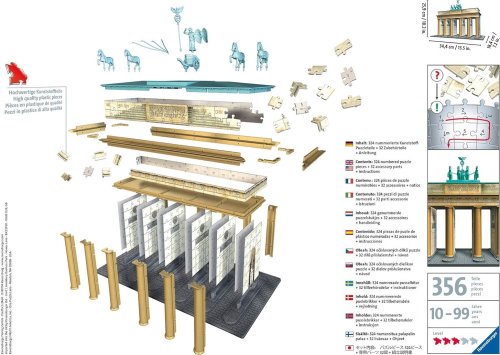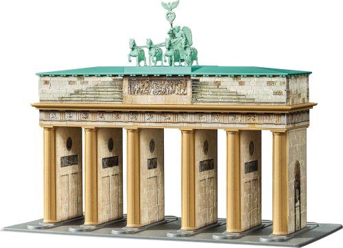 Zažite jedinečnú kombináciu skladania puzzle a stavania modelu a vytvorte slávnu a ohromujúcu berlínsku Brandenburskú bránu. Špeciálne plastové dieliky s jedinečnou technológiou Easyclick a zaujímavo navrhnutými spojmi poskytujú skvelú stabilitu celej stavby. Dieliky presne zapadnú na svoje miesto a celá stavba drží bez nutnosti lepenia. Vďaka originálnym doplnkovým dielikom budú vašu stavbu všetci obdivovať. Balenie obsahuje: 324 očíslovaných plastových puzzle dielikov, 32 dielikov príslušenstva, návod. Obtiažnosť: 3,5. Brandenburská brána, nemecky Brandenburger Tor, patrí k najznámejším pamätihodnostiam Berlína ak jeho významným symbolom. Brandenburská brána stojí v centre mesta as touto stavebnou pamiatkou je spojených mnoho historických udalostí mesta. Brandenburská brána je 26 metrov vysoká, 65,5 metrov široká a 11 metrov dlhá stavba z pieskovca v štýle raného klasicizmu. Má päť prejazdov a svojím vzhľadom silne pripomína aténsku Akropolis. Stavba je zdobená ornamentami a reliéfmi a je korunovaná 5 metrov vysokou sochou kvadrigmi, predstavujúcou okrídlenú bohyňu víťazstva, ktorá vchádza do mesta na štyroch koňoch ťahanom vozidle. Rozmer zloženého puzzle cca 34,4 x 18,4 x 25,9 cm