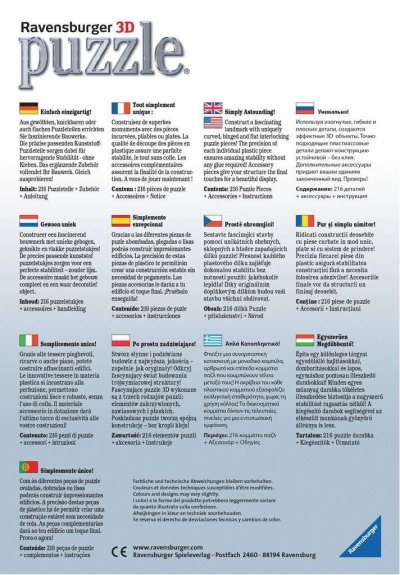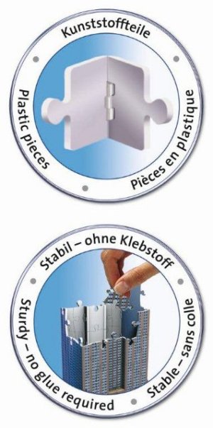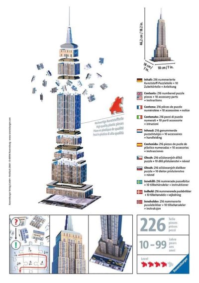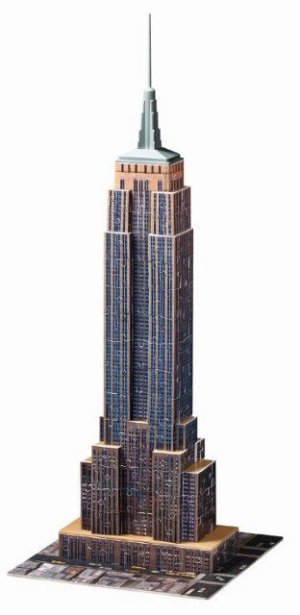 Po úspechu s guľou Puzzleball a pyramídou Puzzlepyramid sa RAVENSBURGER pustil do ďalšej výzvy – a tou sú stavby. Špeciálne zakrivené alebo ohybné dieliky, ktoré presne zapadnú na svoje miesto, umožňujú postaviť fascinujúce modely slávnych budov. Dieliky vyrobené z pevného plastu zaručia vynikajúcu stabilitu, a celá stavba drží bez nutnosti lepenia. Vďaka originálnym doplnkovým dielikom budú vašu stavbu všetci obdivovať. Balenie obsahuje: 216 očíslovaných dielikov puzzle, 10 dielov príslušenstva a návod. Empire State Building je 102 poschodová budova postavená v štýle art deco, nachádzajúca sa v New Yorku v USA na križovatke Piatej Avenue a West 34th Street. Po jej dokončení v roku 1931 sa stala na viac ako 40 rokov najvyššou budovou sveta, v roku 1972 ju prekonala severná veža Svetového obchodného centra. Po zrútení budov pri teroristických útokoch 11. septembra 2001 sa Empire State Building stala najvyššou budovou New Yorku a treťou najvyššou v USA. V roku 1986 sa budova zaradila na zoznam národných kultúrnych pamiatok. Budova je neodmysliteľnou súčasťou mesta, podobne ako Eiffelova veža patrí k Parížu. Viac na Wikipédii Rozmer zloženého puzzle cca 46,2 x 18 x 18 cm