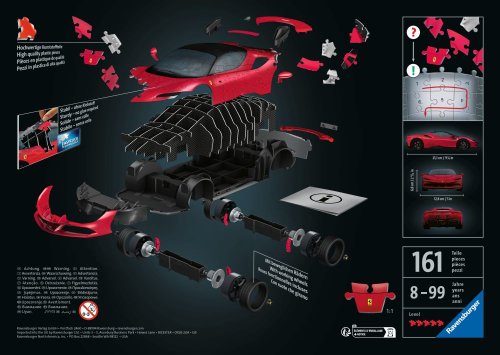 Zažite jedinečnú kombináciu skladania a stavania a vytvorte si pôsobivý model jedného z najikonickejších vozidiel Ferrari SF 90 Stradale v neprehliadnuteľnej červenej farbe zo 108 dielikov. Kvalitné, plastové puzzle s technológiou Easyclick. Bez nutnosti lepenia! S funkčnými otáčacími kolesami. Puzzle obsahuje pevnú vnútornú konštrukciu na zaistenie maximálnej stability zloženého modelu.