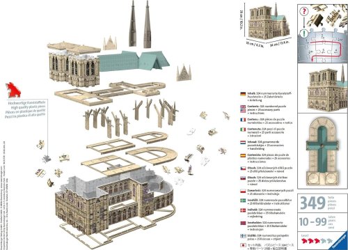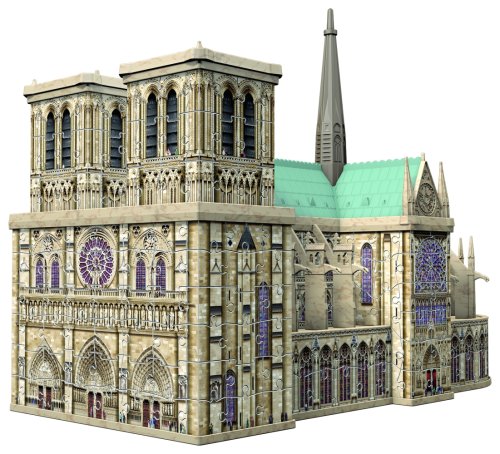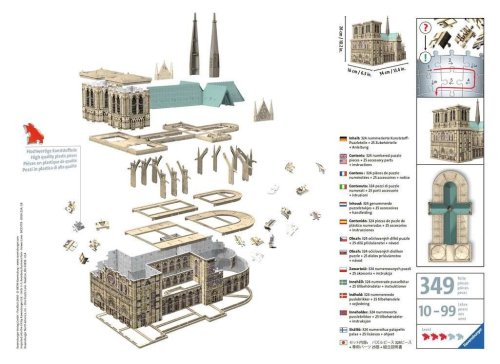 Gotická katedrála Notre-Dame, ktorá krášli francúzske hlavné mesto, teraz ako 3D model od výrobcu Ravensburger. Postavte si zmenšenú verziu európskeho architektonického skvostu. Špeciálne zakrivené alebo ohybné dieliky, ktoré presne zapadnú na svoje miesto, umožňujú postaviť fascinujúce modely slávnych budov. Dieliky vyrobené z pevného plastu zaručia vynikajúcu stabilitu, a celá stavba drží bez nutnosti lepenia. Vďaka originálnym doplnkovým dielikom budú vašu stavbu všetci obdivovať. Balenie obsahuje: 324 očíslovaných dielikov puzzle, 25 dielov príslušenstva a návod. Katedrála Notre-Dame v Paríži (čiže katedrála Panny Márie, zastaralý Chrám Matky Božej), po francúzsky Cathédrale Notre-Dame de Paris, je gotická rímskokatolícka katedrála, stojaca na východnej polovici ostrova Île de la Cité na rieke Seine. Je to domovská katedrála parížskej rímskokatolíckej arcidiecézy a je považovaná za jeden z najkrajších príkladov francúzskej gotickej architektúry. Jej stavba bola zahájená v roku 1163 a po 182 rokoch, roku 1345, bola dokončená. Patrí aj medzi skvosty celoeurópskej stredovekej architektúry – hlavne pre svoj unikátny prechod od neskoro románskej ku gotickej architektúre. Je preslávená tiež použitím vonkajších oporných oblúkov obvodových múrov. Priečelie je zdobené početnými sochami. Výška veží je 69 m. Rozmer zloženého puzzle cca 34 x 16 x 26 cm