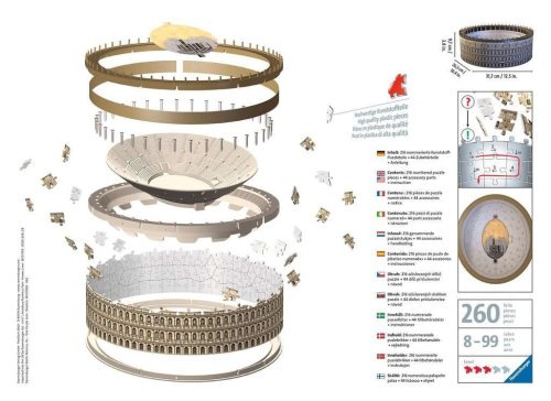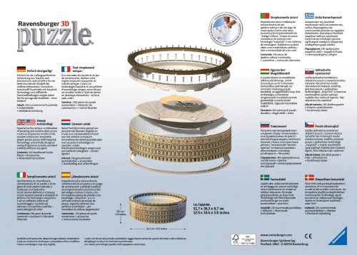 Baví Vás skladať puzzle, ale chcete skúsiť niečo nové? Stále obľúbenejší rad modelov známych stavieb od majstra výroby puzzle RAVENSBURGER Vám zaistí hodiny zábavy. Postavte si slávny rímsky amfiteáter, ktorý slúžil v dávnej dobe nielen gladiátorským zápasom. Špeciálne plastové dieliky s jedinečnou technológiou Easyclick a zaujímavo navrhnutými spojmi poskytujú skvelú stabilitu celej stavby. Dieliky presne zapadnú na svoje miesto a celá stavba drží bez nutnosti lepenia. Vďaka originálnym doplnkovým dielikom budú vašu stavbu všetci obdivovať. Balenie obsahuje: 216 plastových puzzle dielikov, 44 dielov príslušenstva a ilustrovaný návod. Rímske koloseum je elipsovitý amfiteáter v centre mesta Ríma v Taliansku. Ide o najväčší amfiteáter, ktorý bol kedy v rímskej ríši postavený. Pôvodne bolo schopných pojať 50.000 sediacich divákov a bolo používané na gladiátorské zápasy a verejné predstavenia. Neskôr bola využívaná na obývanie, snemovanie, ako pevnosť, kameňolom a kresťanská svätyňa. Hoci periodicky sa opakujúce zemetrasenia a zlodeji kameňov z neho urobili zrúcaninu, dnes sa stavba stala skutočným symbolom cisárskeho Ríma. Je jednou z najpopulárnejších turistických atrakcií. Rozmer zloženého puzzle cca 31,7 x 26,3 x 9,7 cm