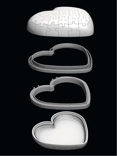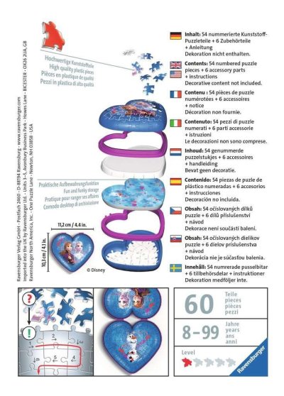 Uzatvárateľná dekoratívna šperkovnica v tvare srdiečka s obrázkami Anny a Elsy z Ľadového kráľovstva. Špeciálne zakrivené alebo ohybné dieliky, ktoré presne zapadnú na svoje miesto, umožňujú postaviť dizajnovú šperkovnicu, ktorá pôsobí veľmi reálne. Dieliky sú vyrobené z pevného plastu a zaručia vynikajúcu stabilitu. Srdce drží bez nutnosti lepenia. Balenie obsahuje: 54 očíslovaných dielikov, 6 ks príslušenstva a návod. Obsah krabičky vyobrazený na fotografii nie je súčasťou balenia. Rozmer zloženého puzzle cca 11,2 x 10,3 cm