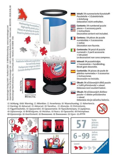 Ceruzky sa už nebudú váľať po stole a navyše bude krásny darček vždy na očiach! Ďalší z radu praktických predmetov vo forme 3D puzzle edície RAVENSBURGER s motívom pouličného graffiti sa stane skvelým darčekom pre každú príležitosť. A nemusí slúžiť iba ako ceruzkovník, ale napríklad ako stojan na kozmetiku a iné veci. Špeciálne zakrivené dieliky, ktoré presne zapadnú na svoje miesto, vytvoria kúzelný stojan nielen na písacie potreby, ale na čokoľvek, čo deti potrebujú. Dieliky sú vyrobené z pevného plastu a zaručia vynikajúcu stabilitu bez nutnosti lepenia. 3D puzzle RAVENSBURGER je možné skladať podľa motívu (obtiažnejší variant) alebo podľa praktického číslovania na zadnej strane dielikov. Balenie obsahuje: 54 očíslovaných dielikov puzzle, 3 diely príslušenstva a návod. Dekorácia nie je súčasťou balenia. Rozmer zloženého puzzle cca 7,7 x 7,7 x 9,5 cm