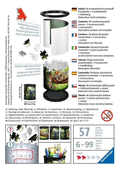 Ceruzky sa už nebudú váľať po stole a navyše bude krásny darček vždy na očiach! Ďalší z radu praktických predmetov vo forme 3D puzzle od výrobcu RAVENSBURGER sa stane skvelým darčekom na každú príležitosť. A nemusí slúžiť iba ako ceruzkovník, ale napríklad ako stojan na dekoratívnu kozmetiku a iné veci. Špeciálne zakrivené dieliky, ktoré presne zapadnú na svoje miesto, vytvoria kúzelný stojan nielen na písacie potreby, ale na čokoľvek, čo deti potrebujú. Dieliky sú vyrobené z pevného plastu a zaručia vynikajúcu stabilitu bez nutnosti lepenia. 3D puzzle RAVENSBURGER je možné skladať podľa motívu (obtiažnejší variant) alebo podľa praktického číslovania na zadnej strane dielikov. Stojan má po zostavení výšku približne 9,5 cm. Balenie obsahuje: