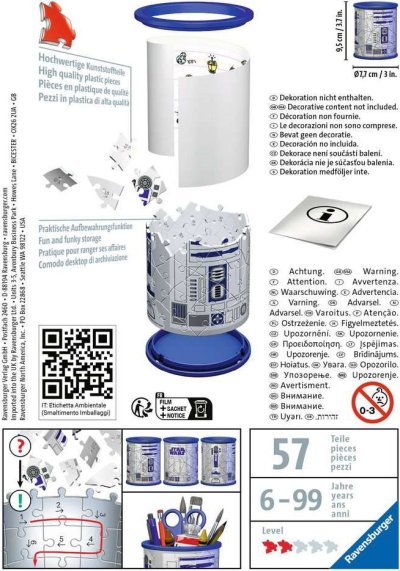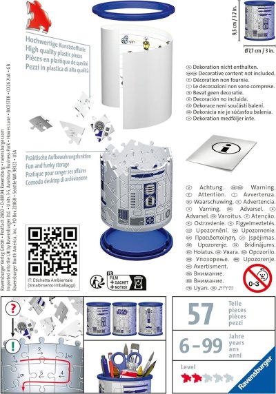 Ceruzky sa už nebudú váľať po stole a navyše bude krásny darček vždy na očiach! Ďalší z radu praktických predmetov vo forme 3D puzzle od výrobcu RAVENSBURGER sa stane skvelým darčekom na každú príležitosť. A nemusí slúžiť iba ako ceruzkovník, ale napríklad ako stojan na dekoratívnu kozmetiku a iné veci. Špeciálne zakrivené dieliky, ktoré presne zapadnú na svoje miesto, vytvoria kúzelný stojan nielen na písacie potreby, ale na čokoľvek, čo deti potrebujú. Dieliky sú vyrobené z pevného plastu a zaručia vynikajúcu stabilitu bez nutnosti lepenia. 3D puzzle RAVENSBURGER je možné skladať podľa motívu (obtiažnejší variant) alebo podľa praktického číslovania na zadnej strane dielikov. Stojan má po zostavení výšku približne 9,5 cm s priemerom 7,7 cm. Balenie obsahuje: