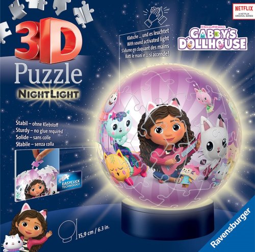 Vďaka nočnej edícii Nachtlicht od Ravensburgeru môže mať očarujúcu svietiacu guľu s animovaným motívom aj Vaše dieťa. Puzzle je veľmi obľúbené nielen vďaka ľahkej manipulácii, ale aj stabilite. Na skladanie nepotrebujete lepidlo, špeciálne vyrobené zakrivené dieliky do seba jednoducho zapadnú a držia tvar. Skladať je možné podľa obrázku alebo podľa čísel - plastové dieliky sú zo zadnej strany očíslované. Priemer puzzleballu je 13 cm. Balenie obsahuje: