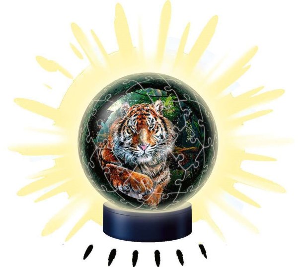 Vďaka nočnej edícii Nachtlicht od Ravensburgeru môže mať očarujúcu svietiacu guľu s motívom krásneho tigra aj Vaše dieťa. Puzzle je veľmi obľúbené nielen vďaka ľahkej manipulácii, ale aj stabilite. Na skladanie nepotrebujete lepidlo, špeciálne vyrobené zakrivené dieliky do seba jednoducho zapadnú a držia tvar. Svetlo sa aktivuje zvukom - stačí kliknúť alebo tlesknúť, a guľa sa rozsvieti. Skladať je možné podľa obrázku alebo podľa čísel - plastové dieliky sú zo zadnej strany očíslované. Priemer puzzleballu je 13 cm. Balenie obsahuje: