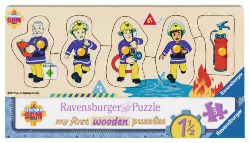Päť vkladacích obrázkov, s láskyplne ilustrovanými motívmi Požiarnika Sama a jeho priateľov zo série Moje prvé drevené puzzle, sú prispôsobené príslušnému veku.