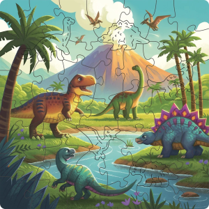 Jedinečné dieliky puzzle do seba perfektne zapadajú. Súčasťou sú 4 drevené figúrky.