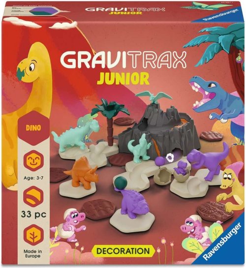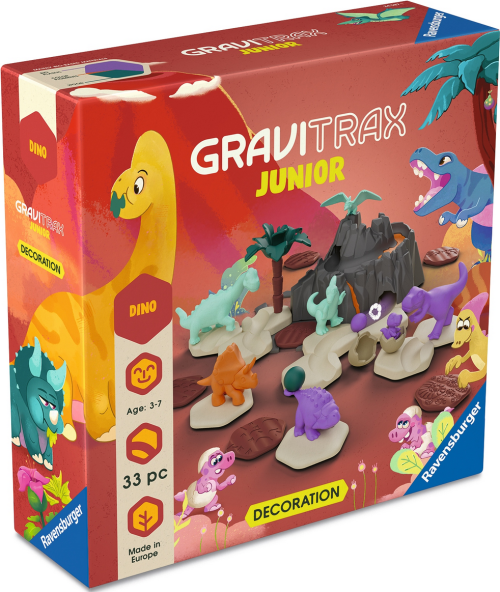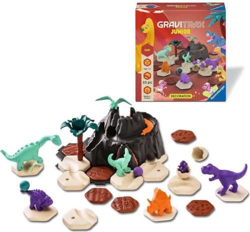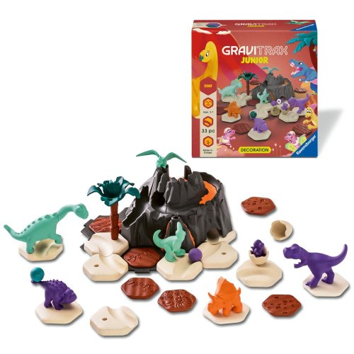 GraviTrax Junior je interaktívny systém guličkovej dráhy pre deti od 3 rokov. Tí najmenší si stavajú svoje vlastné svety z guličkových dráh, ktoré je možné podľa ľubovôle zdobiť a vytvárať tak jednotlivé tematické svety. Deti si tak pri kreatívnom stavaní užijú mnoho zábavy. GraviTrax Junior Dekorácia: Dino obsahuje všetko, čo potrebujete, aby ste mohli ihneď začať stavať a ponoriť sa do sveta dinosaurov. Rôznorodé dinosaurie figúrky, pôsobivá sopka a ďalšie tematické prvky poskytujú nekonečné možnosti stavania a hrania. Táto tematická sada ponúka neobmedzenú zábavu pre všetkých malých fanúšikov GraviTraxu.
