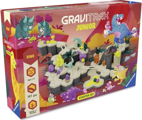 GraviTrax Junior je interaktívny systém guličkovej dráhy pre deti od 3 rokov. Tí najmenší si stavajú svoje vlastné svety z guličkových dráh, ktoré je možné podľa ľubovôle zdobiť a vytvárať tak jednotlivé tematické svety. Deti si tak pri kreatívnom stavaní užijú mnoho zábavy. GraviTrax Junior Štartovná sada XXL Dino obsahuje všetko, čo potrebujete, aby ste mohli ihneď začať stavať a ponoriť sa do sveta dinosaurov. Rôznorodé dinosaurie figúrky, pôsobivá sopka a ďalšie tematické prvky poskytujú nekonečné možnosti stavania a hrania. Táto XXL tematická štartovacia sada ponúka neobmedzenú zábavu pre všetkých malých fanúšikov GraviTraxu.