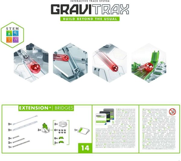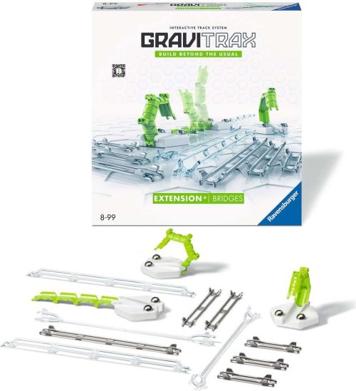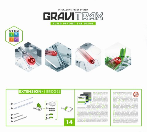 Táto sada doplní vašu stavebnicu GraviTrax® o dva mosty a rad dráh. Mosty sa pred guličkou samy rozbalia a umožnia jej presun na vzdialenú časť trate. Spojte jednotlivé úseky trate vo veľkolepej dráhe a objavte tak celý rad nových konštrukčných možností.