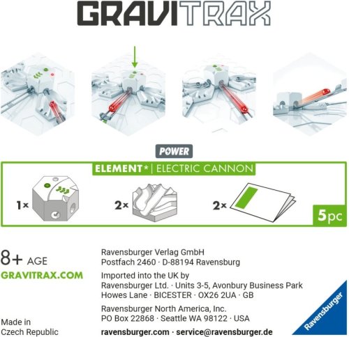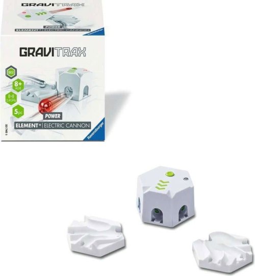 Dodajte svojej dráhe extra šťavu s Elektrickým kanónom! Stačí stlačiť zelené tlačidlo a gulička dostane poriadny impulz, vďaka ktorému poletí po dráhe ešte rýchlejšie. Prevádzka na 2 x 1,5 V batérie (LR3-AAA-AM3). Batérie nie sú súčasťou balenia. Rozširujúci prvok GraviTrax je použiteľný so štartovacou sadou! GraviTrax od nemeckého výrobcu Ravensburger je modulárna guličková dráha s možnosťou ďalších rozšírení, ktorá nadchne malých aj veľkých staviteľov. Stavajte, pretekajte s guličkami a vyskúšajte silu gravitácie v praxi! Prepracovaná stavebnica s variabilnými dielikmi Vám umožní vytvoriť si vlastný systém spletitých guličkových dráh alebo postaviť niektoré z predpripravených riešení. Z jednotlivých stavebných prvkov vytvoríte cestičky plné rôznych akcií, ktorými budú guličky postupne prechádzať. Systém guličkových dráh RAVENSBURGER GraviTrax môžete ľubovoľne rozširovať o ďalšie a ďalšie doplnky a vytvárať tak nové podoby zložitých a unikátnych cestičiek s vytunenými prekážkami. Stavebnica zaručuje nikdy nekončiacu zábavu okorenenú rozširovaním vedomostí o vlastnostiach gravitácie. Plánujte dráhy odkiaľkoľvek! S pomocou aplikácie GraviTrax môžete dráhy navrhovať aj na svojom mobile alebo tablete a potom všetko vyskúšať v praxi.