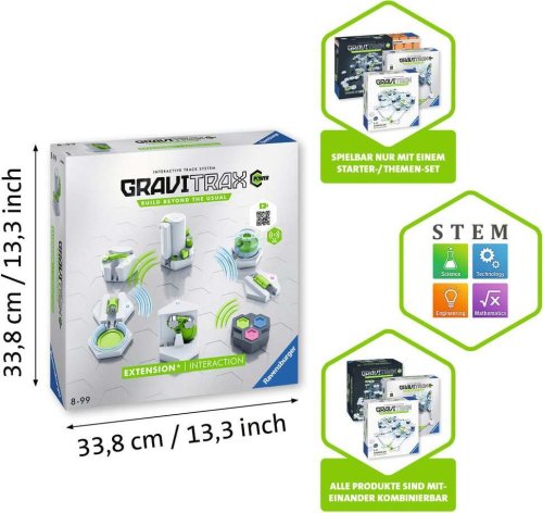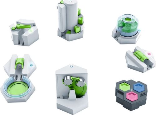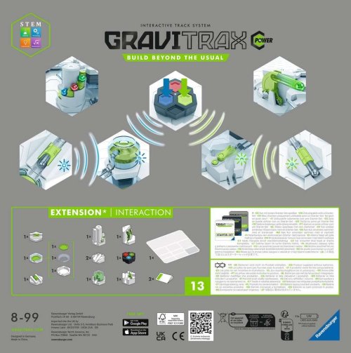 Veľká sada všetkých elektronických doplnkov z radu GraviTrax Power, vrátane ovládača elektronických prvkov, pre nekonečnú GraviTrax jazdu. Elektronické doplnky medzi sebou komunikujú – vysielajú a prijímajú signály. Akonáhle gulička prejde Spúšťačom, spustí sa signál. Hráč určí, či má na signál reagovať Výhybka, Štartér alebo akčný kameň Páka. Na navolenie dráhy guličky je možné použiť ovládač elektronických doplnkov, ktorý je súčasťou balenia. Elektronické Schodisko automaticky vyváža guličky na poschodie bez nutnosti ručného resetovania. Tým sa generuje nová energia a prakticky nekonečná jazda môže začať. Toto rozšírenie je možné plne použiť iba s jednou zo štartových sád GraviTrax. Prevádzka na 11 x 1,5 V batérie (LR3-AAA-AM3). Batérie nie sú súčasťou balenia. Rozširujúce prvky GraviTrax Power sú použiteľný so štartovacou sadou! GraviTrax od nemeckého výrobcu Ravensburger je modulárna guličková dráha s možnosťou ďalších rozšírení, ktorá nadchne malých aj veľkých staviteľov. Stavajte, pretekajte s guličkami a vyskúšajte silu gravitácie v praxi! Prepracovaná stavebnica s variabilnými dielikmi Vám umožní vytvoriť si vlastný systém spletitých guličkových dráh alebo postaviť niektoré z predpripravených riešení. Z jednotlivých stavebných prvkov vytvoríte cestičky plné rôznych akcií, ktorými budú guličky postupne prechádzať. Systém guličkových dráh RAVENSBURGER GraviTrax môžete ľubovoľne rozširovať o ďalšie a ďalšie doplnky a vytvárať tak nové podoby zložitých a unikátnych cestičiek s vytunenými prekážkami. Stavebnica zaručuje nikdy nekončiacu zábavu okorenenú rozširovaním vedomostí o vlastnostiach gravitácie. Plánujte dráhy odkiaľkoľvek! S pomocou aplikácie GraviTrax môžete dráhy navrhovať aj na svojom mobile alebo tablete a potom všetko vyskúšať v praxi.
