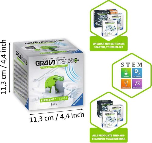 Elektronická páka zdvíha guličky do výšky 3,5 výškových dlaždíc a nevyžaduje ručné resetovanie pre každú novú dráhu. Vďaka pohonu na batérie je tento doplnok nepretržite pripravený na ďalšiu dráhu. Je na hráčovi, aby sa rozhodol: Buď sa Páka zakaždým automaticky resetuje potom, čo prepraví guľôčku, alebo sa vráti do pôvodnej pozície na prepravu ďalšej guličky po tom, čo dostane signál od Spúšťača alebo ovládača elektronických doplnkov. V kombinácii s novými Štartovými sadami GraviTrax Power je možné dráhu guličiek šikovne ovládať. Kedy by sa podľa vás mala Páka počas jazdy resetovať?