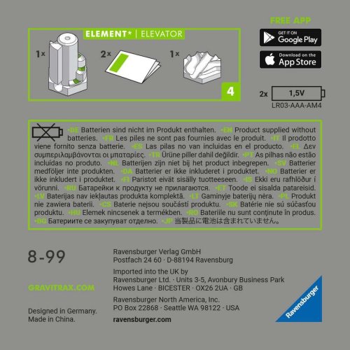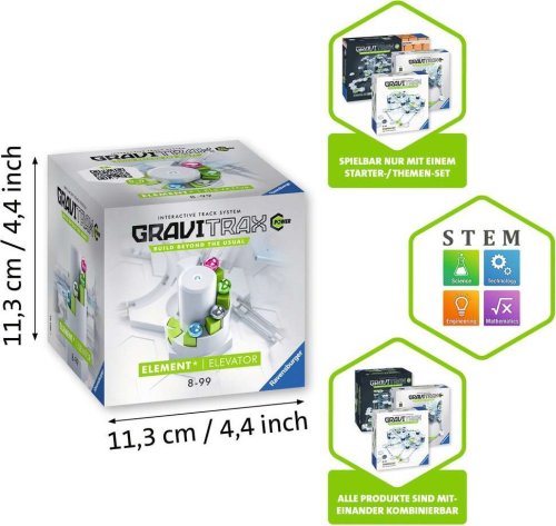 Elektronické Schodisko automaticky vyvezie niekoľko guličiek naraz do výšky až 7 výškových kameňov. Nevyžaduje ručné resetovanie pre novú dráhu. Vďaka pohonu na batérie je tento doplnok nepretržite pripravený na ďalšiu dráhu. Akonáhle gulička vojde na prvý schod elektronického Schodiska, je automaticky prepravovaná nahor. Tým vzniká nová energia pre ďalšie guličky. V kombinácii s novými Štartovými sadami GraviTrax Power začína nekonečný cyklus zábavy s guličkovou dráhou GraviTrax. Koľko guličiek dokáže Schodisko prepraviť súčasne? Prevádzka na 2 x 1,5 V batérie (LR3-AAA-AM3). Batérie nie sú súčasťou balenia. Rozširujúci prvok GraviTrax Power Schodisko je použiteľný so štartovacou sadou! GraviTrax od nemeckého výrobcu Ravensburger je modulárna guličková dráha s možnosťou ďalších rozšírení, ktorá nadchne malých aj veľkých staviteľov. Stavajte, pretekajte s guličkami a vyskúšajte silu gravitácie v praxi! Prepracovaná stavebnica s variabilnými dielikmi Vám umožní vytvoriť si vlastný systém spletitých guličkových dráh alebo postaviť niektoré z predpripravených riešení. Z jednotlivých stavebných prvkov vytvoríte cestičky plné rôznych akcií, ktorými budú guličky postupne prechádzať. Systém guličkových dráh RAVENSBURGER GraviTrax môžete ľubovoľne rozširovať o ďalšie a ďalšie doplnky a vytvárať tak nové podoby zložitých a unikátnych cestičiek s vytunenými prekážkami. Stavebnica zaručuje nikdy nekončiacu zábavu okorenenú rozširovaním vedomostí o vlastnostiach gravitácie. Plánujte dráhy odkiaľkoľvek! S pomocou aplikácie GraviTrax môžete dráhy navrhovať aj na svojom mobile alebo tablete a potom všetko vyskúšať v praxi.