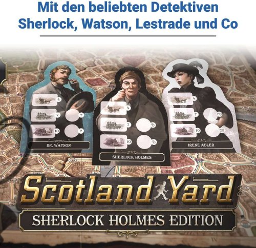Jeden hráč sa ujme role Moriartyho, ostatní hrajú Sherlocka Holmesa a jeho tím detektívov. Začína napínavá naháňačka viktoriánskym Londýnom. Podarí sa Moriartymu uniknúť? Scotland Yard potrebuje vašu pomoc! Profesor Moriarty je na úteku. Naposledy bol videný, ako uteká teplovzdušným balónom nad Temžou! Použite svoje dedukčné schopnosti, aby ste ho dopadli, ale buďte opatrní... Moriarty je nebezpečný a spriada plány na ďalšie zločiny. Nájdite ho, než bude neskoro! V tejto verzii hry Scotland Yard pátra Sherlock Holmes a jeho spoločníci po zločineckom géniovi, profesorovi Moriartym. Môžete si vybrať, či budete hrať detektívov, alebo Moriartyho. Hru môžete hrať podľa pôvodných pravidiel alebo podľa špeciálnych pravidiel Sherlocka Holmesa. Obsah balenia: 1 herný plán, 29 štartových kariet, 134 lístkov, 6 hracích figúrok, 10 žetónov postáv, 6 hráčskych tabuliek, 1 cestovná tabuľka s papierom a ceruzkou, 1 kartónový prúžok, 1 šilt, 3 krúžky (strážnici), 15 kariet z miesta činu, 1 pravidlá hry „Ach, to ste vy... poďte ďalej! Pán Holmes a ostatní vás už očakávajú. Spoločnými silami určite uspejete a konečne dopadnete profesora Moriartyho!“ Dvere bytu na Baker Street 221B sa zatvárajú – hon na Moriartyho začína!