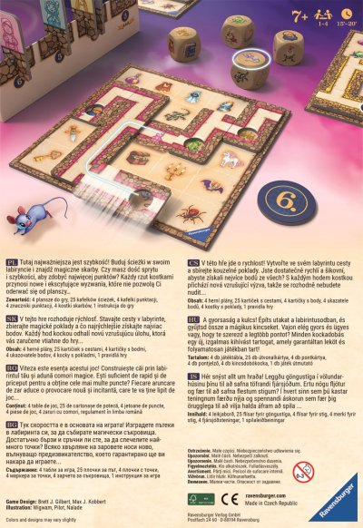 4 herné plány, 24 obojstranných kartičiek s cestami, 1 menšia žolíková kartička, 4 obojstranné kartičky s bodmi, 4 ukazovatele bodov, 4 kocky s pokladmi.