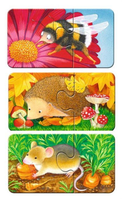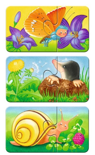 Dvojdielne puzzle s krásnymi obrázkami špeciálne vytvorené pre najmenšie deti. Robustné pevné dieliky sú vyrobené z extra silného kartónu a podporujú u detí rozvoj motoriky, sústredenia a fantázie. Medzi deviatimi obrázkami nájdete obľúbené zvieratká, ktoré môžete stretnúť na záhrade av jej okolí: motýľ, ježko, lienka a ďalšie. Rozmer zloženého puzzle cca 18 x 10 cm