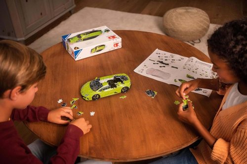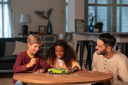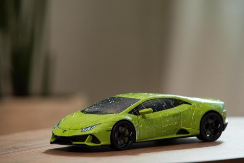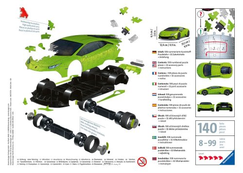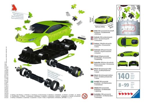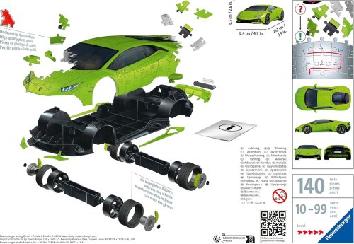Radi by ste mali vlastný Lamborghini? Postavte si športiak Lamborghini Huracán Evo, ktorý je dokonalým spojením technológie a designu. Farebný 3D model v zelenej farbe a pohyblivými kolesami je replikou skutočného automobilu v mierke 1:18. Špeciálne zakrivené dieliky presne zapadnú na svoje miesto a umožňujú postaviť fascinujúci model. Dieliky vyrobené z pevného plastu zaručia vynikajúcu stabilitu, a celý model drží bez nutnosti lepenia. Vďaka originálnym doplnkovým dielikom budú Váš model všetci obdivovať. 3D puzzle RAVENSBURGER je možné skladať podľa motívu (obtiažnejší variant) alebo podľa praktického číslovania na zadnej strane dielikov. Balenie obsahuje: 108 očíslovaných dielikov puzzle, 32 dielov príslušenstva a návod.