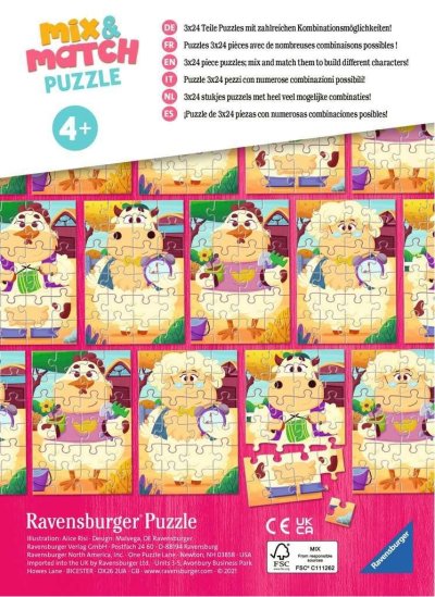 Miešaj a skladaj! Môžeš poskladať motívy podľa obrázkov alebo vzájomne kombinovať a miešať jednotlivé dieliky zo všetkých troch puzzle a vytvárať nové smiešne postavy. To bude zábava! V jednej krabičke nájdete tri puzzle pre deti s 24 dielikmi.