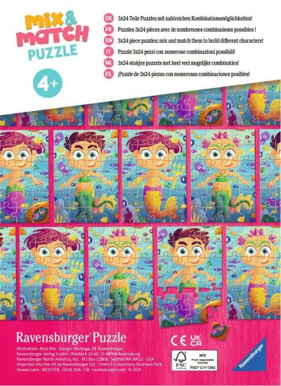 Miešaj a skladaj! Môžeš poskladať motívy podľa obrázkov alebo vzájomne kombinovať a miešať jednotlivé dieliky zo všetkých troch puzzle a vytvárať nové smiešne postavy. To bude zábava! V jednej krabičke nájdete tri puzzle pre deti s 24 dielikmi.