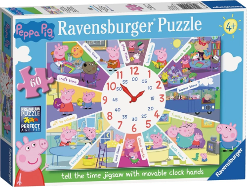 Prasiatko Pepina má nabitý program! Skladanie puzzle, rozprávanie sa o obrázkoch a otáčanie pohyblivými plastovými ručičkami na ciferníku hodín je skvelý spôsob, ako deti zoznámiť s pojmom čas. Deti tak môžu porovnávať svoj deň s Pepinou! O koľkej chodia do školy, obedujú, kúpu sa alebo chodia spať? Rozmer zloženého puzzle cca 49 x 36 cm