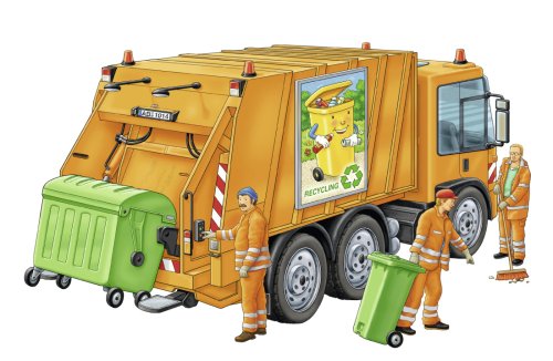 Doskové puzzle s motívom Odvozu odpadu. Zložený obrázok má veľkosť 32,5 x 24,5 cm. Obrázok je zložený z 35 dielikov.