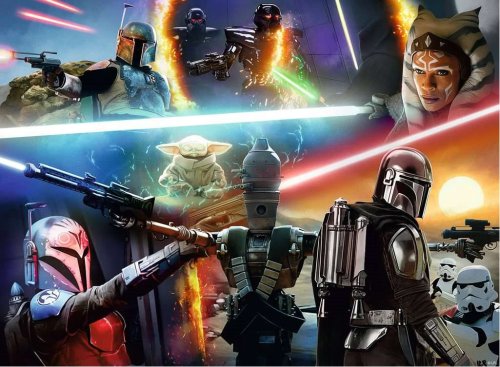 Prerazte si cestu naprieč galaxiou s naším Mandalorianom a vydajte sa na cestu. Spojte sily s mandalorianskym lovcom odmien Dinom Djarinom, ktorý sa snaží ochrániť Grogu (alias Baby Yodu) pred zlovoľným Moffom Gideonom! Svetelné meče a blasterové lúče múdro rámujú scény z obľúbeného seriálu Disney+, v ktorých Mandovi pomáhajú priatelia a spojenci. Na pomoc mu prichádza mandaloriánsky kolega Bo-Katan Kryza, lovec odmien Boba Fett, IG-11 a bývalá Jedi Ahsoka Tano. Dokonca sa objaví aj majster Jedi Luke Skywalker, ktorý zrazí Temných vojakov, aby Grogu zachránil pred silami zla! Rozmer zloženého puzzle cca 49 x 36 cm