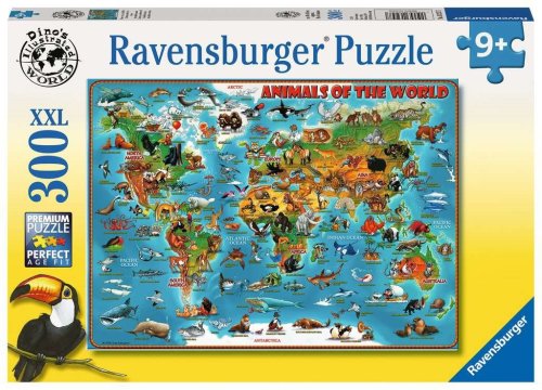 Puzzle pre deti s motívom mapy so zvieratami sveta s veľkými XXL dielikmi pre jednoduchšie skladanie. Odporúčané pre deti od 6 rokov. Rozmer zloženého puzzle cca 49 x 36 cm