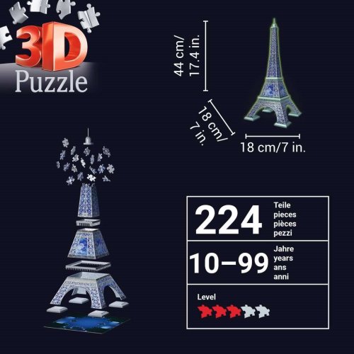 Eiffelova veža v špeciálnej Svietiacej edícii! Svietiaca stavba od majstra vo výrobe puzzle RAVENSBURGER. Každý z perfektne prepracovaných 224 plastových dielikov umožňuje postaviť fascinujúci model slávnej Eiffelovky. Neónové - fluorescenčné puzzle má špeciálnu potlač, ktorá po nasvietení v tme svieti. Obsah balenia: puzzle, návod. Rozmer zloženého puzzle cca 44 x 18 x 18 cm
