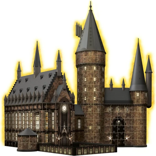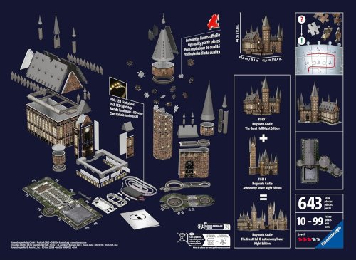 Nočná edícia Rokfortskej školy čiar a kúziel! Stavba z výroby nemeckej spoločnosti RAVENSBURGER sa vďaka LED svetlu v tme farebne rozžiari. Nočný hrad je skvelým darčekom aj nevšedným kúskom v 3D rozmere. Špeciálne ohybné dieliky, ktoré vďaka technológii EASYCLICK presne zapadnú na svoje miesto, umožňujú postaviť fascinujúci model. Dieliky vyrobené z pevného plastu zaručia vynikajúcu stabilitu a celá stavba drží bez nutnosti lepenia. Vďaka originálnym doplnkovým dielikom budú vašu stavbu všetci obdivovať. Balenie obsahuje: plastové puzzle dieliky, príslušenstvo, svetelný modul vr. svetelného pásu LED a návod. Na prevádzku výrobku je potrebné 3 ks 1,5V batérie AAA (nie sú súčasťou výrobku). Obtiažnosť: 3,5 Rozmer zloženého puzzle cca 40,8 x 41,6 x 44 cm