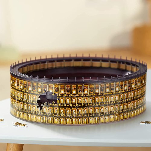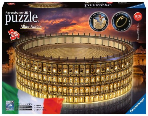 Nočná edícia slávneho rímskeho Kolosea! Stavba z výroby nemeckej spoločnosti RAVENSBURGER sa vďaka LED svetlu v tme farebne rozžiari. Nočný staroveký amfiteáter je skvelým darčekom aj nevšedným kúskom v 3D rozmere. Špeciálne ohybné dieliky, ktoré vďaka technológii EASYCLICK presne zapadnú na svoje miesto, umožňujú postaviť fascinujúci model. Dieliky vyrobené z pevného plastu zaručia vynikajúcu stabilitu a celá stavba drží bez nutnosti lepenia. Vďaka originálnym doplnkovým dielikom budú vašu stavbu všetci obdivovať. Obtiažnosť: 3,5. Balenie obsahuje: 216 očíslovaných dielikov puzzle, 46 dielov príslušenstva vrátane svetelného LED pásu a návod. Na prevádzku výrobku je potrebné 3ks 1,5v batérie AAA (nie sú súčasťou balenia). Rozmer zloženého puzzle cca 31,7 x 26,3 x 9,7 cm