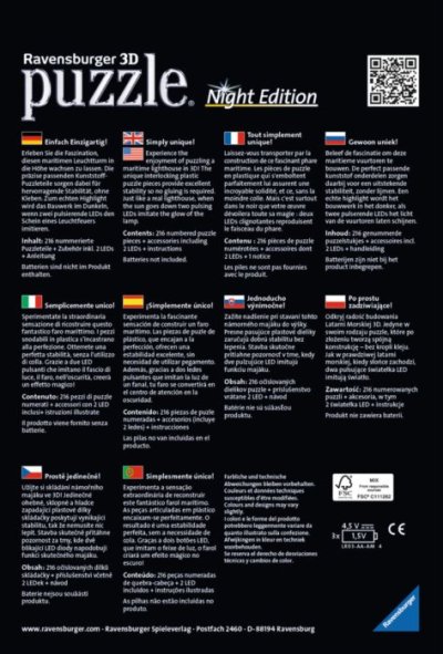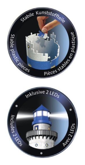 Maják so skutočným svetlom rozširuje rad stavieb v Nočnej edícii. Dve blikajúce LED diódy dokonale simulujú skutočnú prevádzku majáka. Nočný maják RAVENSBURGER zaručene pritiahne pozornosť av noci posvieti všetkým oneskorencom na cestu do postele. Špeciálne zakrivené alebo ohybné dieliky, ktoré vďaka technológii EASYCLICK presne zapadnú na svoje miesto, umožňujú postaviť fascinujúci model majáka v príboji. Dieliky vyrobené z pevného plastu zaručia vynikajúcu stabilitu, a celá stavba drží bez nutnosti lepenia. Vďaka originálnym doplnkovým dielikom budú vašu stavbu všetci obdivovať. Odporúčaný vek: 12 - 99 rokov Balenie obsahuje puzzle, príslušenstvo vrátane 2 LED a návod. Batérie 3x AAA nie sú súčasťou výrobku.